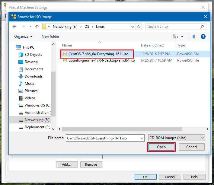 06. Selecting Linux iso image: Select newly created virtual machine. Then right click on it for “Settings”. Now select “CD/DVD (IDE)” and browse to where you have copied your CentOS 7 iso image. Select that file and click “OK”.
