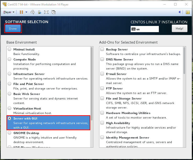 03. Flavor selection: In this step, select “Software Selection”. Then select “Server with GUI”. Finally click on “Done” .