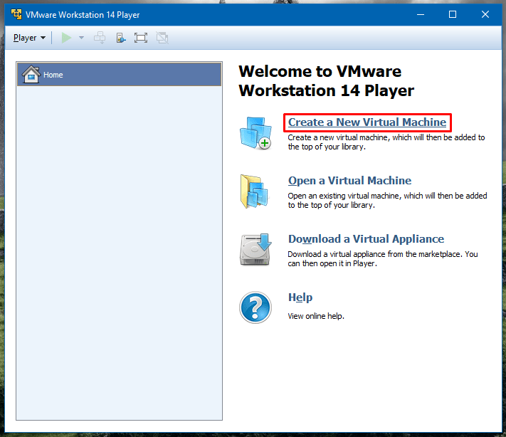 01. Creating a virtual machine: Open VMware Workstation Player and select “Create a New Virtual Machine”.
